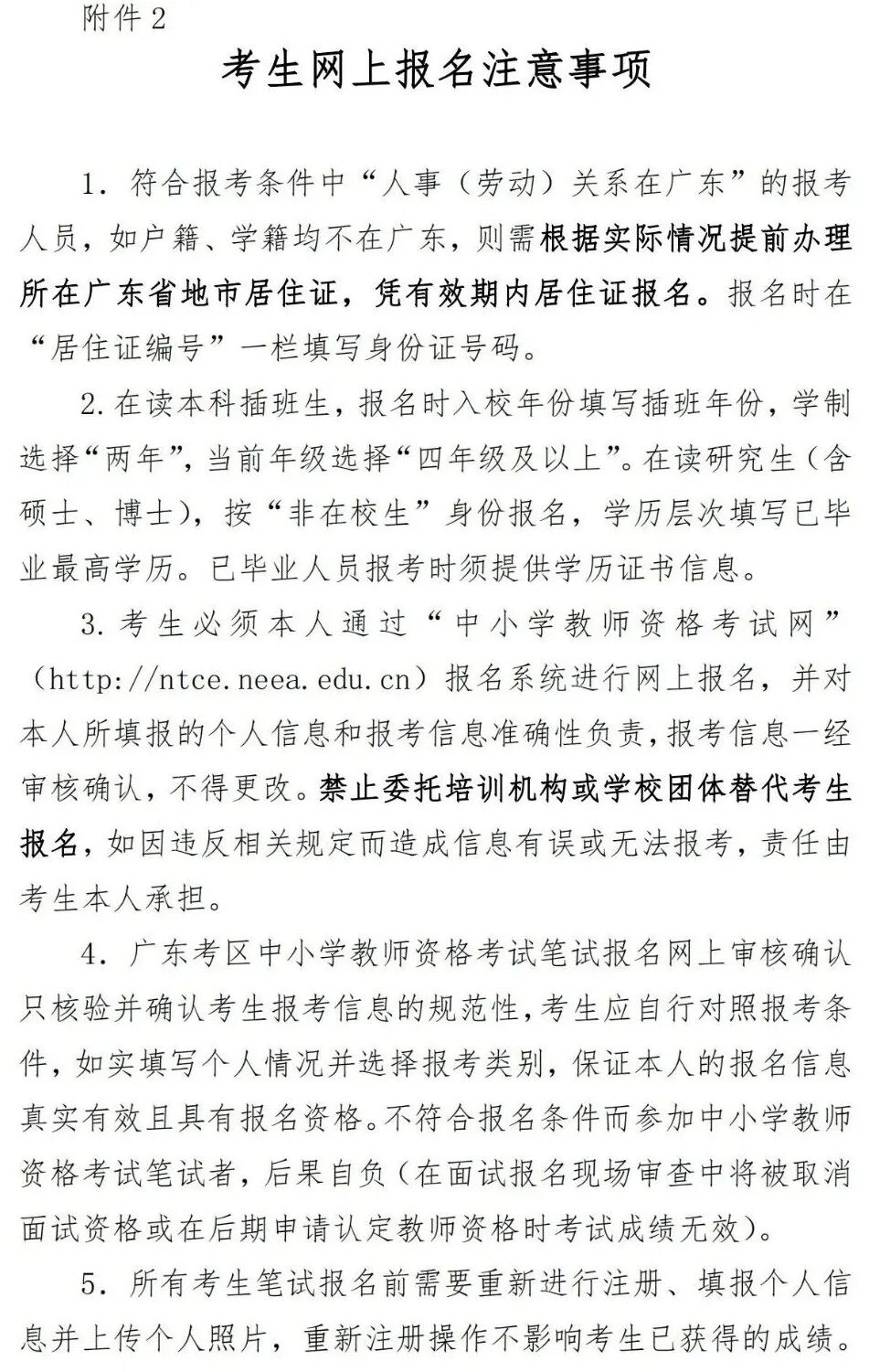 一、报名对象及条件   (一)报考条件 1.具有中华人民共和国国籍,身体健康。 2.遵守宪法和法律,热爱教育事业,具有良好的思想品德。 3.具有广东户籍,或人事(劳动)关系在广东(需持有效期内广东省内居住证)。 4.符合《教师法》规定的学历要求。 5. 广东省内普通高等学校三年级及以上的全日制学生、毕业学年的全日制专科生以及广东省内幼儿师范学校毕业学年的全日制在校生,可凭学校出具的在籍学习证明报考相应的教师资格。   6.在内地(大陆)学习、工作和生活的港澳台居民,凡遵守《中华人民共和国宪法》和法律,拥护中国共产党领导,坚持社会主义办学方向,贯彻党的教育方针,根据自愿原则,可申请参加中小学教师资格考试。港澳台居民参加中小学教师资格考试的有效证件为港澳台居民居住证、港澳居民来往内地通行证、五年有效期台湾居民来往大陆通行证。在内地(大陆)就读师范专业的港澳台居民执行就读省份相应师范生政策。   (二)免考条件 1.2016年5月31日以前入学的全日制幼儿师范学校师范生、全日制普通高等学校师范生和全日制教育硕(博)士可以直接申请认定与所学专业、学段相对应的教师资格。 2.根据2020年8月17日召开的国务院常务会议决定,教育部出台了《教育部关于印发<教育类研究生和公费师范生免试认定中小学教师资格改革实施方案>的通知》(教师函〔2020〕5号),请相关考生密切关注。符合条件的教育类研究生、公费师范生可参加学校组织的教育教学能力考核,也可自愿参加国家中小学教师资格考试,申请认定相应的教师资格。如已报名2020年下半年中小学教师资格考试(含2020年上半年转考至下半年考生),可在9月11-16日期间,通过中小学教师资格考试报名系统申请退费。逾期未申请退费的考生,将被视同自愿放弃退费。 3.根据教育部教师资格认定指导中心《关于中小学和幼儿园教师资格考试成绩全国有效的通知》(教资字〔2012〕24号)精神,已在外省参加过全国中小学教师资格考试笔试且取得单科以上合格成绩的考生,在满足我省报考条件的前提下,其合格科目在有效期内可免予考试。   (三)下列人员不得报考 被撤销教师资格的,5年内不得报名参加考试;受到剥夺政治权利,或故意犯罪受到有期徒刑以上刑事处罚的,不得报名参加考试。曾参加教师资格考试有违纪作弊行为的,按照《国家教育考试违规处理办法》(教育部第33号令)的相关规定执行。   二、报名工作安排   (一)报名时间 第一段笔试报名及提交网上审核:2020年9月11日9:30至12日16:00,内地考生须选择户籍、居住证申领地或学籍所在地市所辖的考区,港澳台考生可根据实际情况选择应试考区; 第二段笔试报名及提交网上审核:2020年9月13日12:00-17:00,考区释放因审核不通过而产生的剩余考位,户籍、居住证申领地或学籍属于广东省的考生及港澳台考生均可选择尚有余位的考区报考; 网上缴费截止日期:2020年9月16日; 打印准考证时间:2020年10月26日至31日。   (二)报名方式 考生通过中小学教师资格考试网站(http://ntce.neea.edu.cn)进行网上报名。2020年下半年教师资格考试报名系统需对考生“居住证”申领所在地等信息进行采集。具体报名流程及注意事项见附件1、2。 考生必须本人报考,并对所填报的个人信息和报考信息准确性负责,报考信息一经审核确认,不得更改。因考生个人原因造成信息有误或无法报考,责任由考生本人承担。   (三)考试费用及缴纳方式 根据《广东省发展改革委 广东省财政厅关于调整中小学教师资格考试收费标准的复函》(粤发改价格函〔2016〕978号)规定的笔试收费标准,按70元/人·科次缴纳笔试考试费。考生以网上缴费方式缴纳考试费。   三、笔试时间及科目 本次笔试各科目名称、代码和有关说明见附件3。笔试各科目采用纸笔方式进行。   四、其他事项   (一)考试大纲及标准 中小学教师资格考试大纲由教育部统一制定,试题由教育部考试中心统一命制。考试不统一指定教材,考生可通过国家中小学教师资格考试网(http:// ntce.neea.edu.cn)下载《考试标准》和《考试大纲》,根据考试大纲知识点自行复习、备考。   (二)成绩查询与复核 本次笔试成绩将于2020年12月10日在“中小学教师资格考试网”(http:// ntce.neea.edu.cn)公布,考生可自行登录查询成绩。考生如对本人的笔试成绩有异议,可在考试成绩公布后10个工作日内按规定程序向考试所在考区教育考试机构提出书面复核申请,考区教育考试机构汇总后上交省教育考试院。申请须注明申请人准考证号、姓名、身份证号、需复核科目代码、网上查询到的成绩、联系电话。复核内容仅限于答题卡扫描是否准确,答卷是否漏评、漏登分,成绩统计合成是否有误,不涉及评分标准掌握宽严问题。省教育考试院在接到教育部考试中心复核结果后通知考生所属考区教育考试机构,由考区教育考试机构告知考生。   (三)违规处理 参加全国中小学教师资格考试的考生以及考试工作人员、其他相关人员,如有违反考试管理规定和考试纪律,影响考试公平、公正的行为,按照《国家教育考试违规处理办法》(教育部令第33号)、《中华人民共和国刑法修正案(九)》及有关法规处理。   (四)考位统计 因考位有限,如考区报名额满则关闭考区。本着公平、公正、公开的原则,我院将在报名期间每天11:00、16:00统计各考区剩余考位,